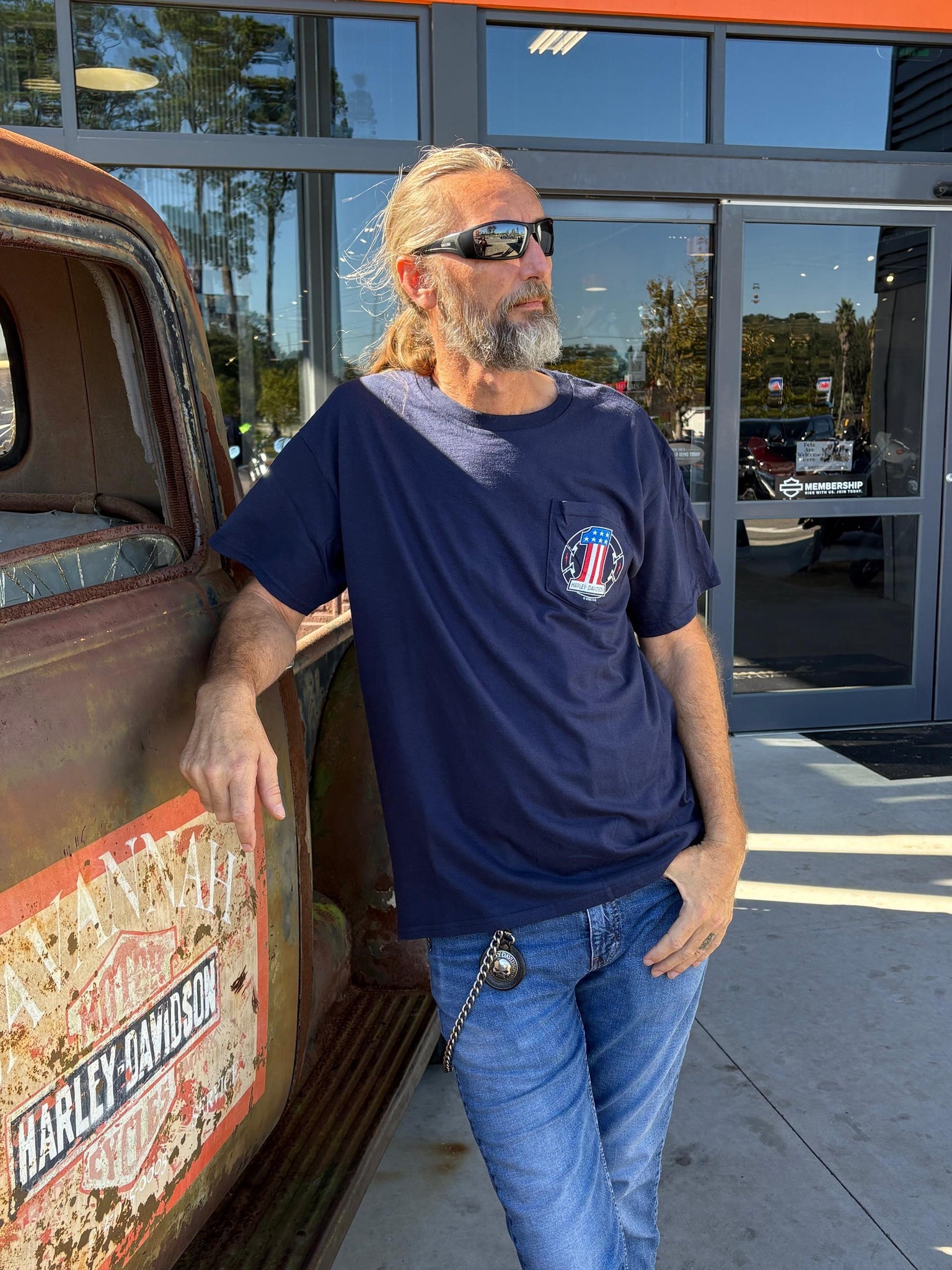 This navy blue T-shirt features a detailed Harley-Davidson emblem on the chest pocket area, showcasing a bold, patriotic design with red, white, and blue colors, and stars and stripes that evoke a sense of Americana. The shirt has a classic fit with short sleeves and a round neckline, made from soft, comfortable fabric suitable for riding or casual wear. It embodies the spirit of Harley-Davidson and the vibrant culture of Savannah, making it perfect for motorcycle enthusiasts and fans of American heritage. Available sizes SM-3X. Model is tall and in a LG.