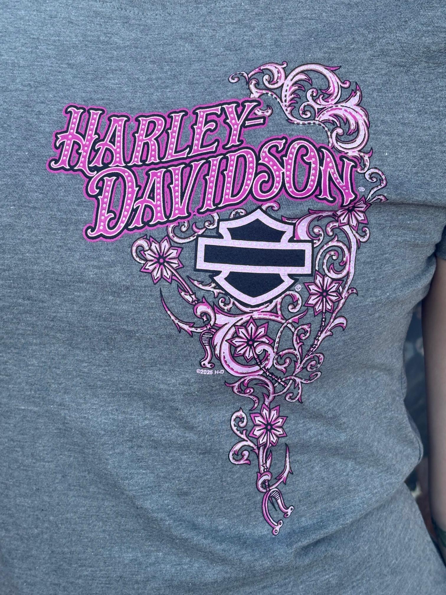 Celebrate your love for the open road with this stylish women's Savannah Harley Davidson T-shirt. Featuring a vibrant pink and purple Harley Davidson logo with intricate floral and scroll details, this tee combines edgy biker spirit with feminine flair. Made from soft, breathable fabric, it offers all-day comfort whether you're riding or showcasing your passion for Harley. Perfect for motorcycle enthusiasts and free spirits, this custom design makes a bold statement of adventure and empowerment. Ride in style and express your unique personality with this eye-catching piece! Available sizes XS-2X, Model is in a SM.